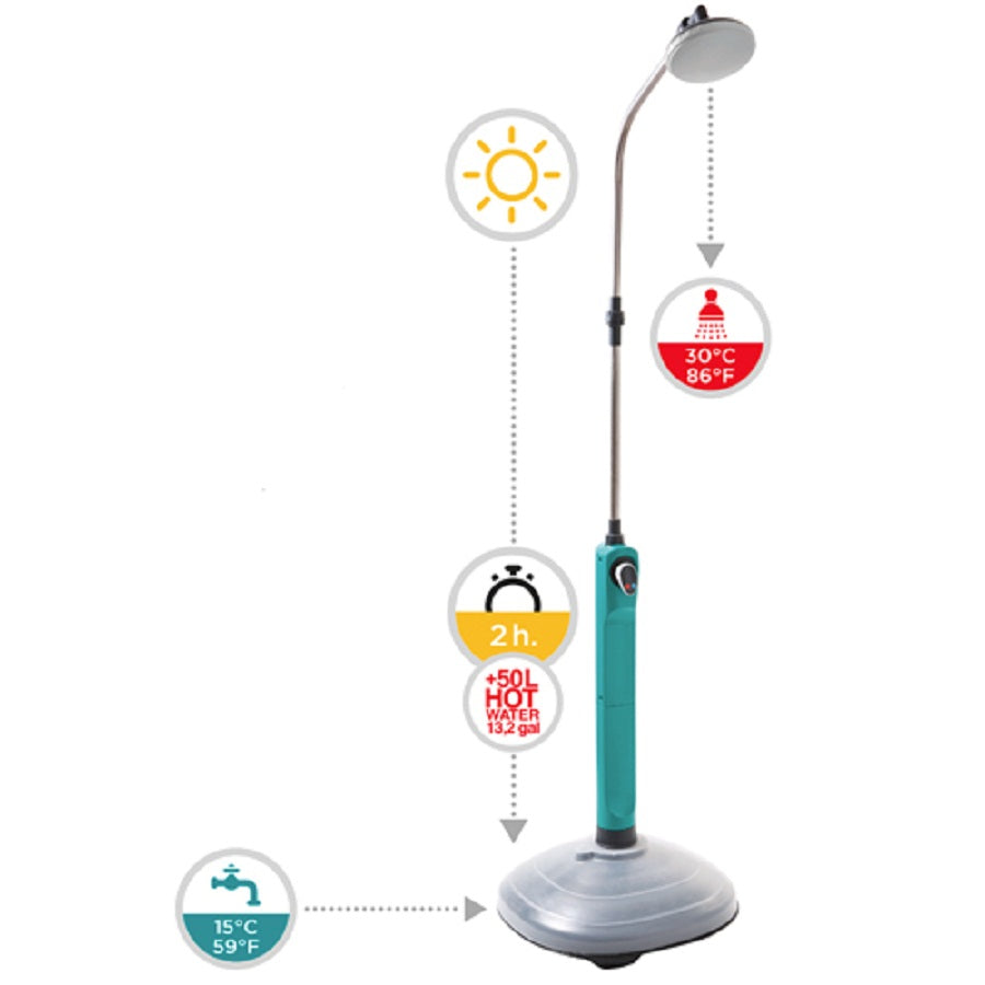 შხაპი მზის ენერგიაზე, მზის სიმხურვალის საშუალებით ძირზე დამაგრებული ოვალური აზვი ცხელდება და მივიღებთ ცხელ წყალს. მოწყობილობას აქვს წყალი და ცხელი წყლის შემრევი სარეგულირებელი ონკანი რის საშუალებითაც შეგიძლიათ მიიღოთ სასურველი გარემო შხაპს ასევე შეგიძლიათ არეგულიროთ სიმაღლე.